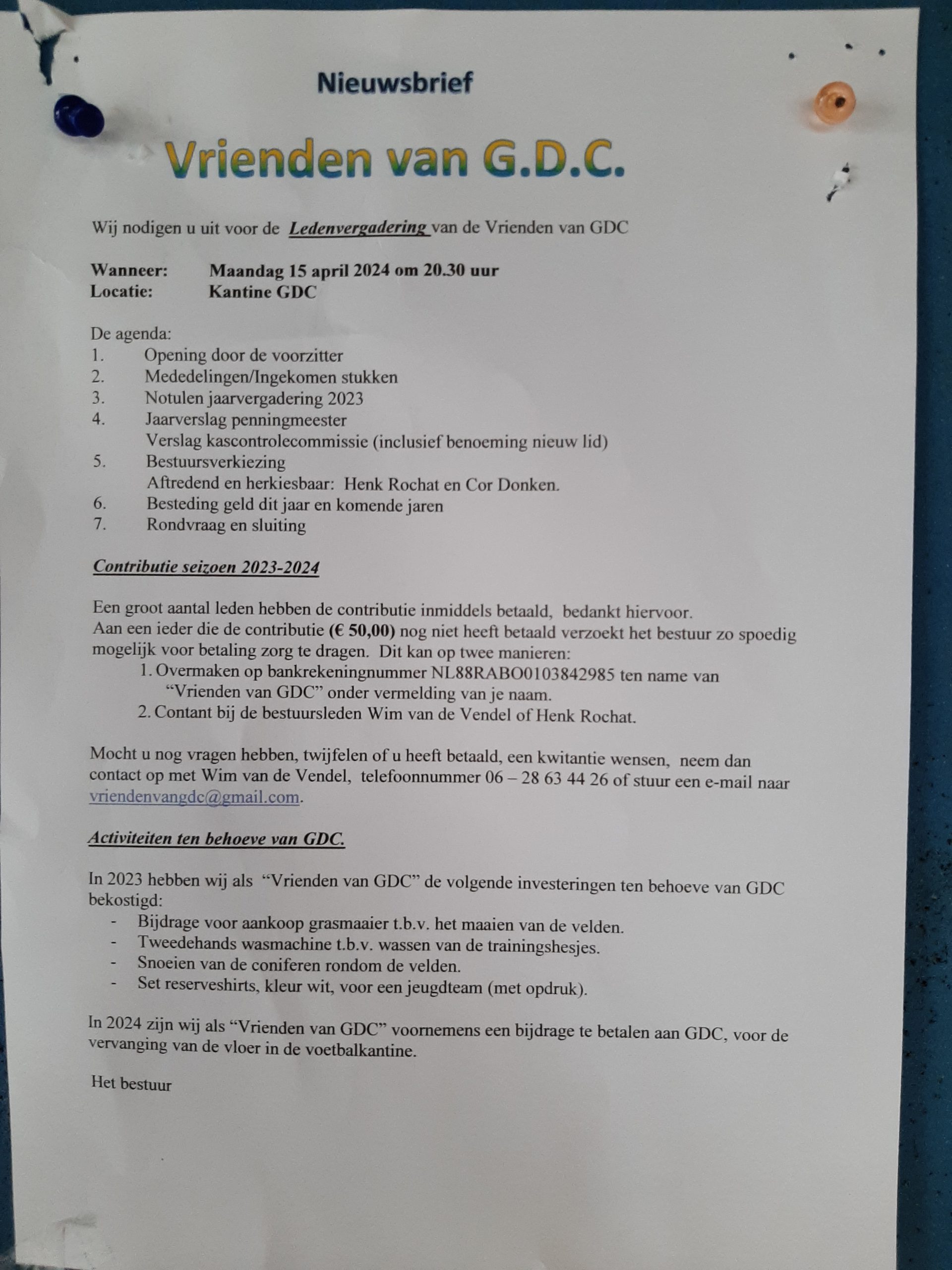 Maandag 15 april is om 20.30u de ledenvergadering van Vrienden Van GDC: